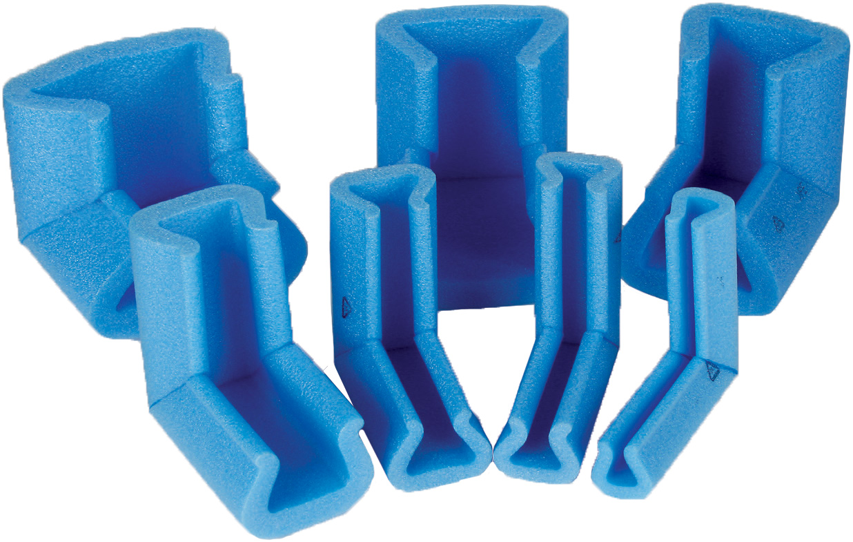 Stødabsorberende hjørnebeskyttelse i kraftig blå skum. Sidder fast på emnet grundet den unikke “tulip” form.
